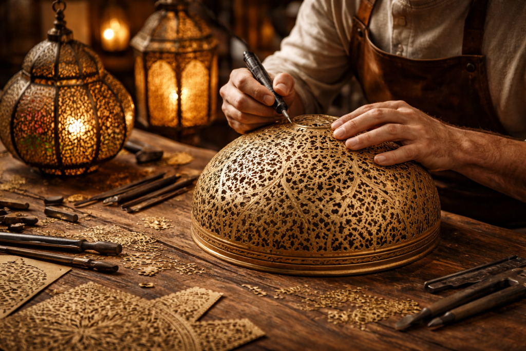 Each lamp begins as a sheet of brass or copper. Artisans hammer, pierce, and engrave the surface by hand, often using repeating geometric motifs found in Islamic art. These patterns are mathematical, symbolic, and precise — designed to repeat endlessly without beginning or end.