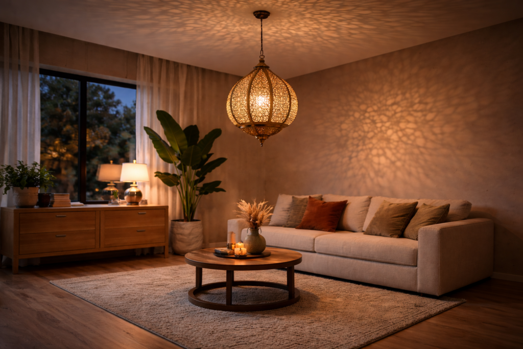 Unlike glass or fabric shades that diffuse light, metal lanterns filter it. Tiny perforations, geometric carvings, and arabesque patterns break light into fragments. The room becomes part of the lamp, as surfaces receive and reflect its projections.