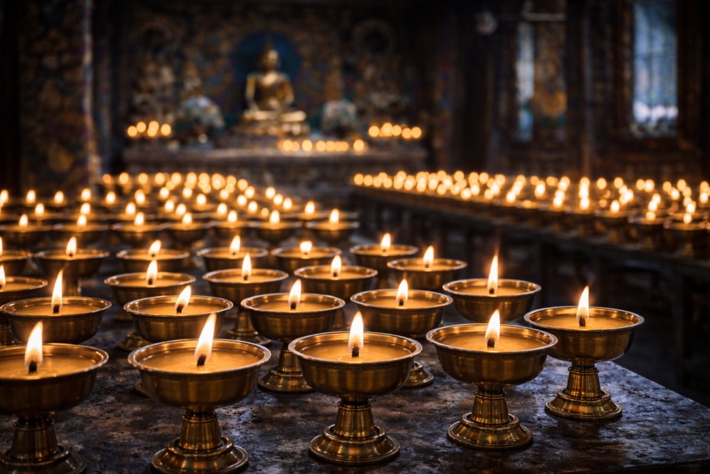 Beyond monasteries, butter lamps appear in homes. A single flame on a windowsill or shrine becomes part of daily rhythm. Morning begins with light. Evening ends with its fading.