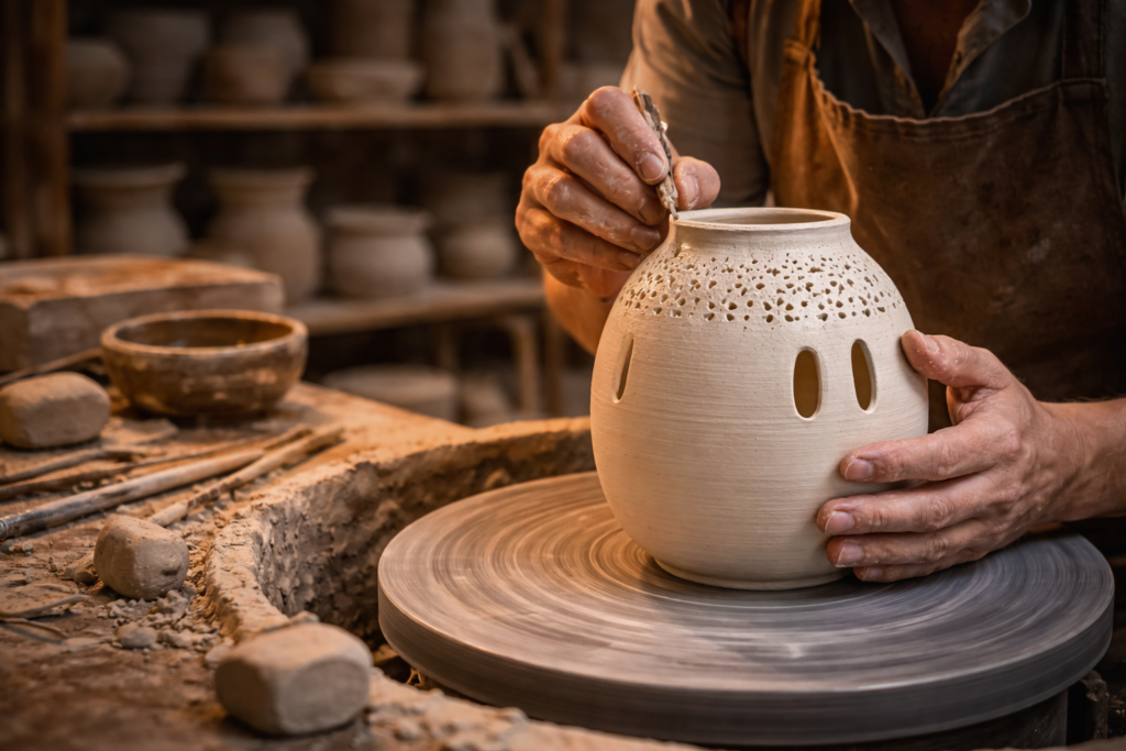 The journey starts on the wheel. Potters control thickness with intent. A vessel destined to become a lamp is drawn thinner than one meant to hold water. Walls are refined until they hover between strength and fragility. Every millimetre matters. Too thick, and light will die inside. Too thin, and the piece may collapse in firing.