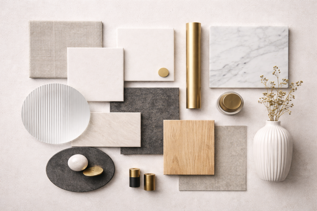 Neutral palettes are at the core of contemporary spaces—whites, greys, blacks, and taupes—but they are punctuated with striking accent tones. A single bold colour, introduced through art, cushions, or a feature wall, brings energy without overwhelming the room. Metallic finishes like chrome, brushed steel, or bronze add sophistication, while natural wood or stone accents soften the overall feel.