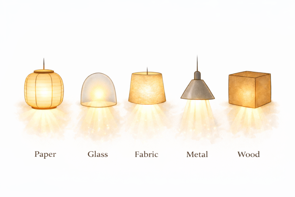 Every material transforms light differently. Paper diffuses and warms. Fabric absorbs and softens. Glass refracts and sparkles. Metal reflects and directs. Wood and bamboo ground the glow.