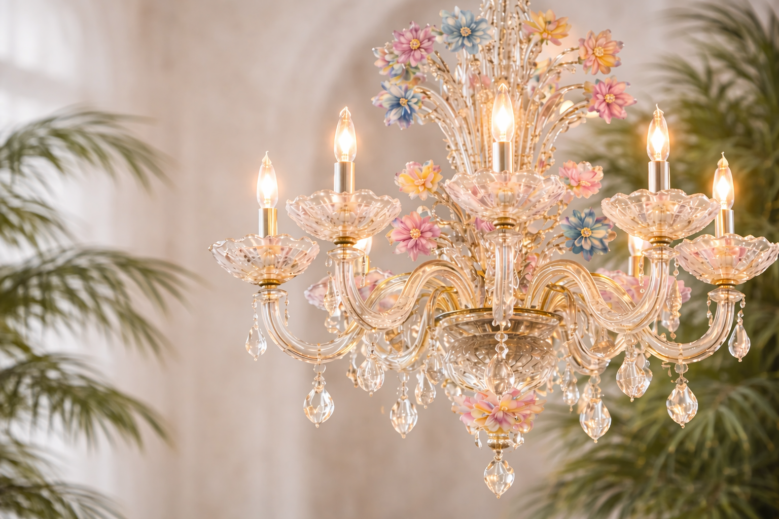 Unlike metal frameworks dressed in crystal, Murano chandeliers are built almost entirely from glass. Arms curve like stems. Leaves unfurl. Flowers bloom. Each element is formed by hand, attached while still warm, and shaped through breath, gravity, and rotation.