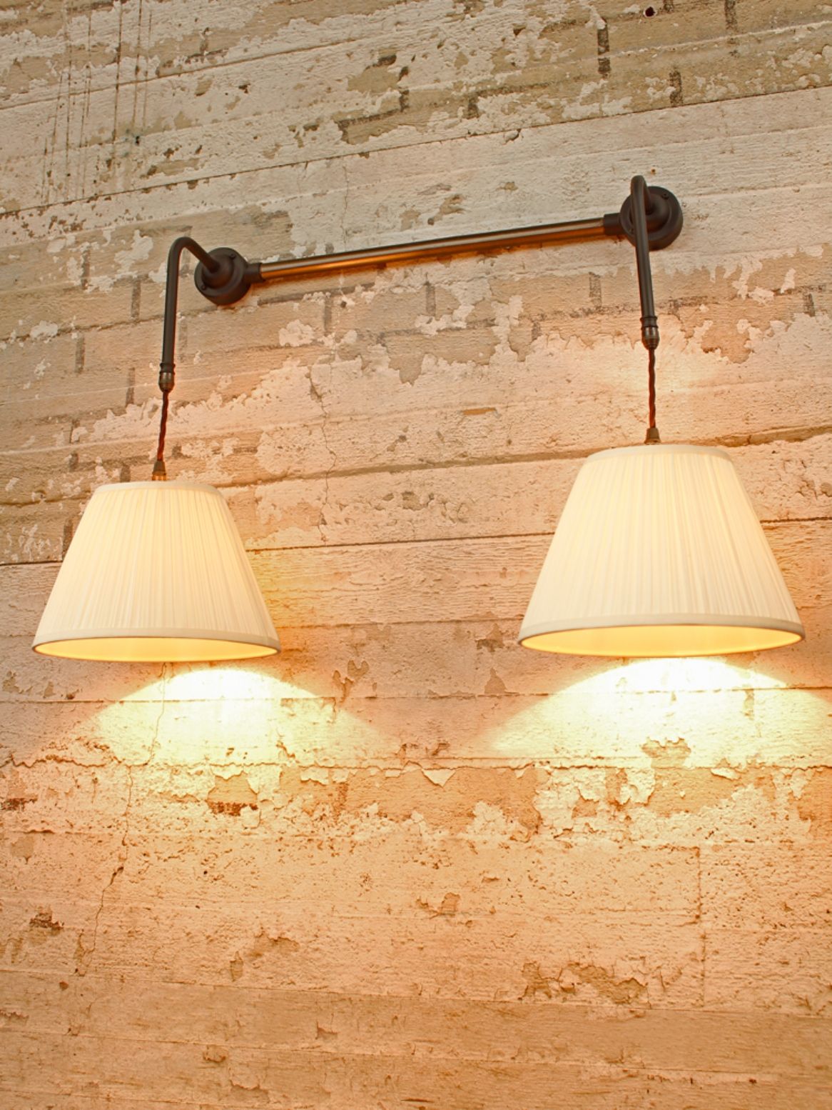 Industrial conduit gold wall light with double black arms and beige pleated shades.