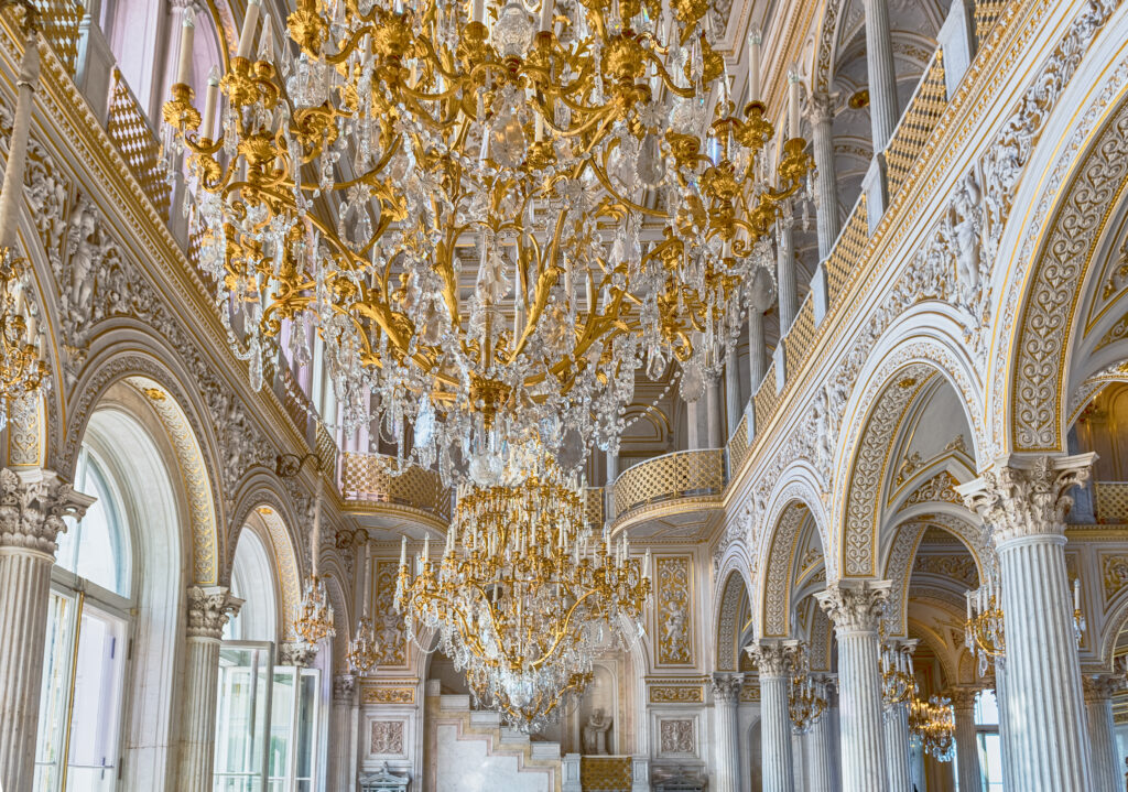 Suspended beneath the hall’s dome are 28 crystal and brass chandeliers, glowing like jewels above the marble floor. Commissioned by Empress Catherine the Great in the 18th century, they were crafted by European artisans from Bohemia, France, and Italy. Each chandelier was meticulously made, combining hand-cut crystal with finely cast brass, embodying centuries of lighting tradition and artistic luxury.
