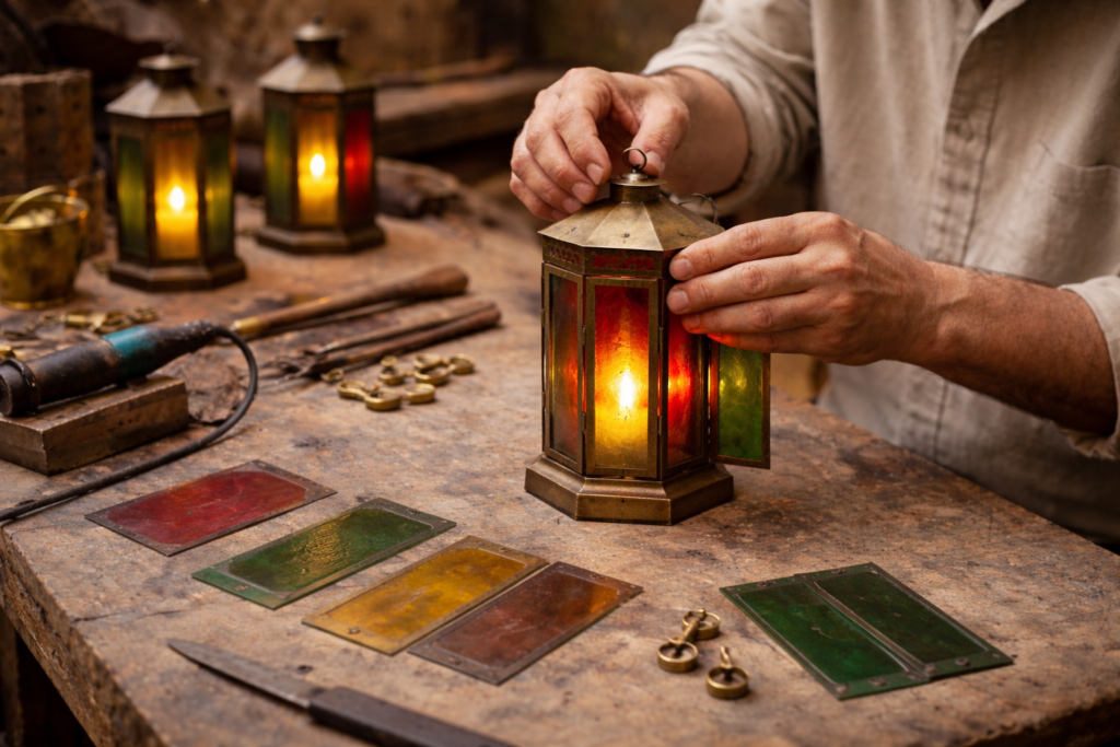 Traditional Egyptian fanous lanterns are often made from metal frames with coloured glass panels. Intricate cut-out patterns allow light to pass through, creating decorative shadows and a warm, glowing effect.