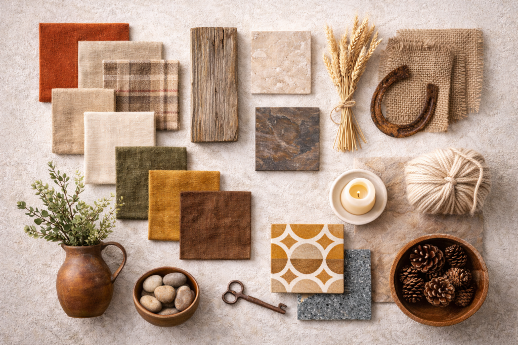 Earthy tones dominate rustic palettes. Browns, beiges, and taupes create a warm foundation, while deep reds, forest greens, and burnt oranges bring richness and variety. These colours echo the natural landscape, working beautifully with exposed wood, stone, and leather to create a sense of comfort and groundedness.