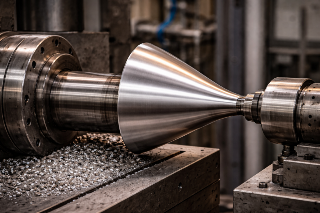 As the lathe spins, pressure is applied from the outside. The aluminium flows over the mandrel’s surface, stretching and thinning as it goes. No material is removed. The sheet is redistributed, drawn into depth.