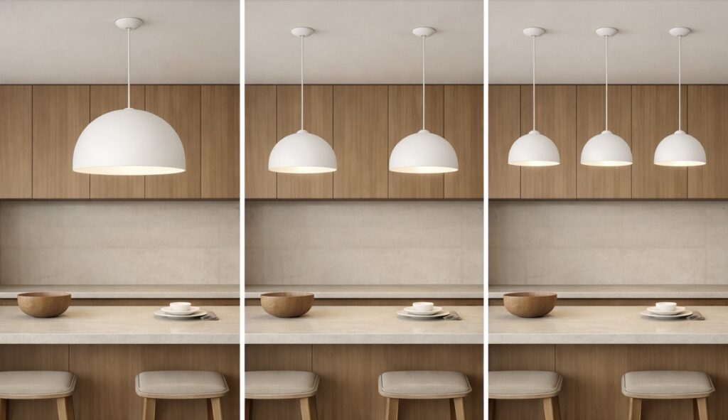 Kitchen islands rarely suit a single oversized pendant. Multiple smaller pendants usually feel more balanced and provide better task lighting.